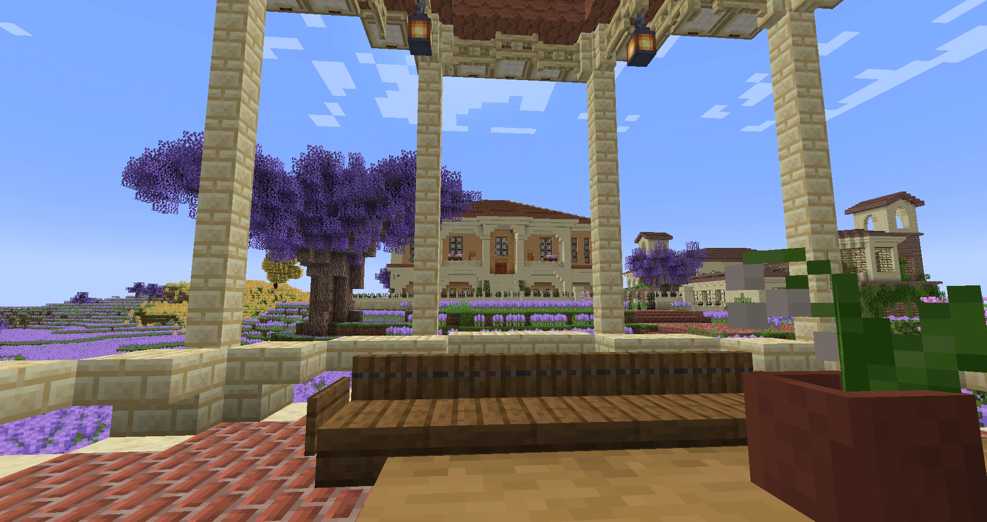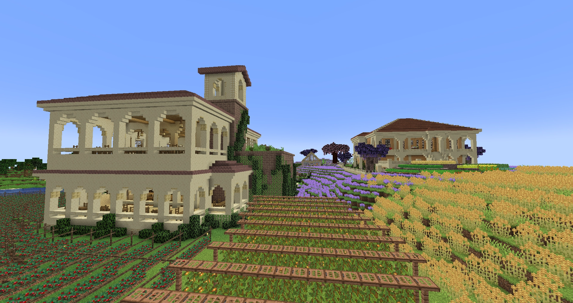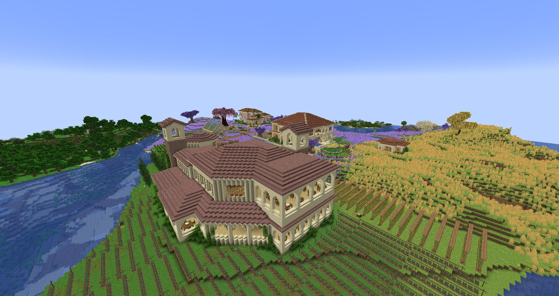 A mansion, house, giant restaurant, vineyard, flower greenhouse, and gazebo, with cherry blossom and jacaranda trees in lavender fields. Inspired by spanish terracotta tile roofs.