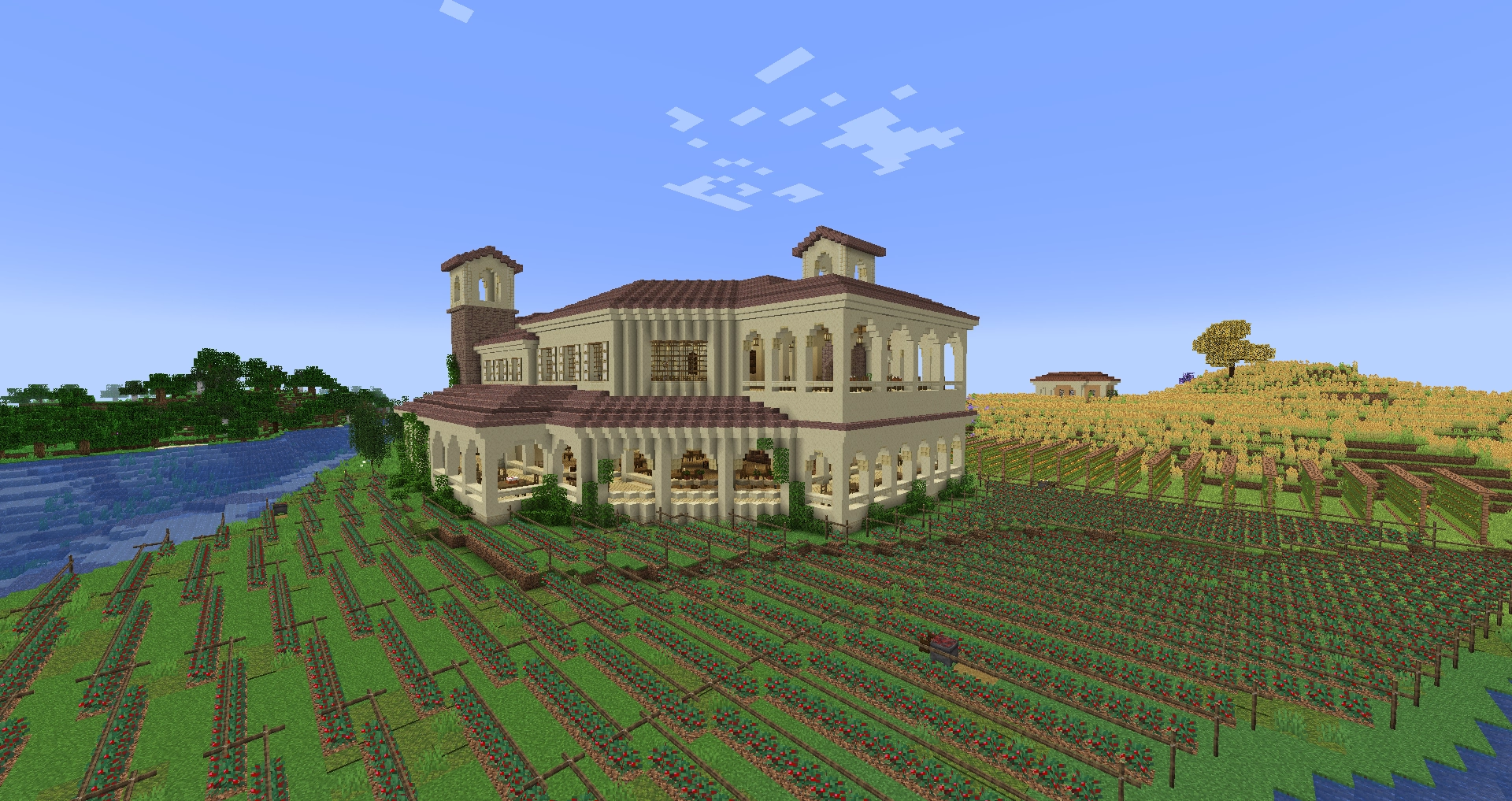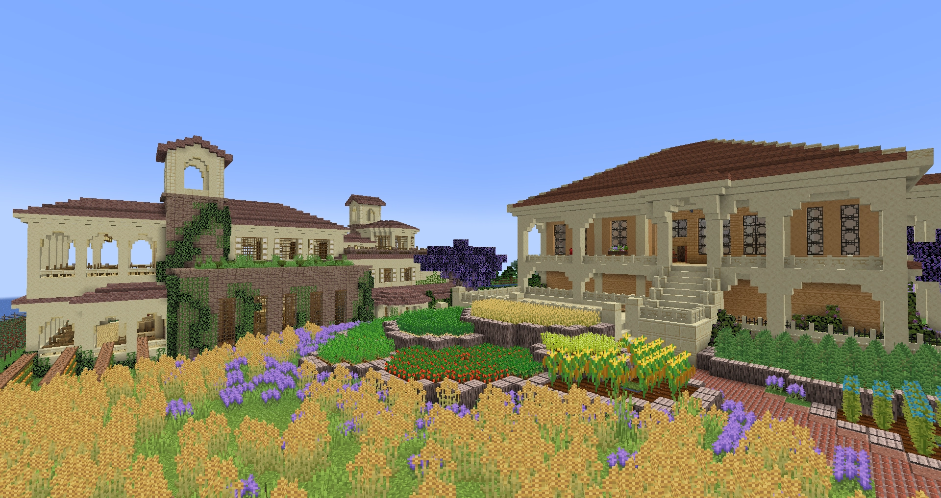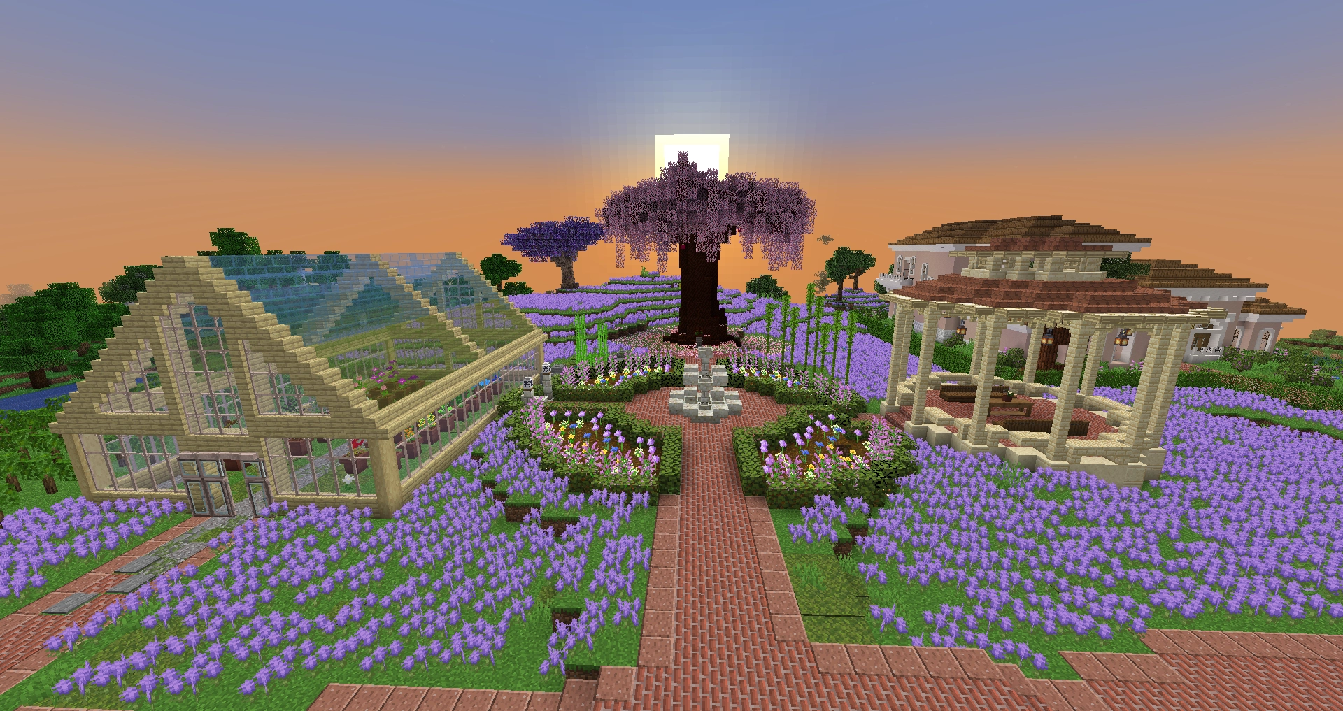 A mansion, house, giant restaurant, vineyard, flower greenhouse, and gazebo, with cherry blossom and jacaranda trees in lavender fields. Inspired by spanish terracotta tile roofs.